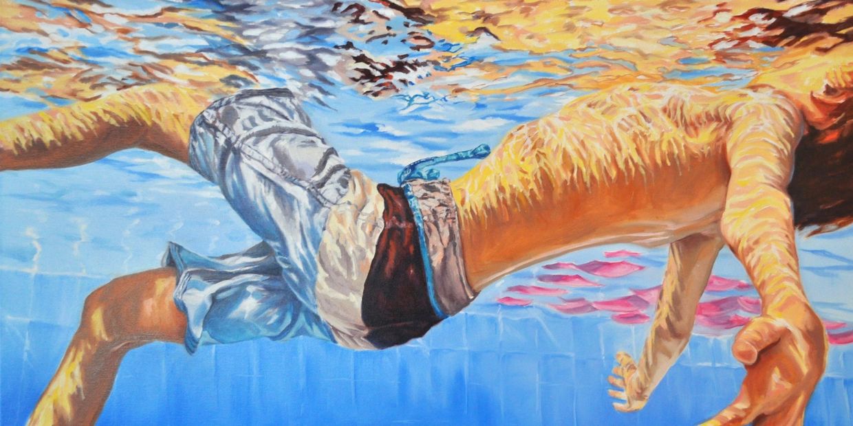 "Among the various subjects I paint, I am most drawn to the element of water. During travel with my family to places such as Europe and Asia, I have become drawn to its’ tranquil, healing energy. I notice the way that play and activities, centered around water, unite generations. This inspires me to create oil paintings of figures submerged in water. In these paintings, I explore the figures’ weightlessness, buoyancy, and tranquility, capturing them mid-float while at play. In these paintings I offer engaging perspectives and up-close views, focusing on detailed reflections, ripples, and bubbles caused by the figures and their relationship with the water; both the body of water and the body of the person each affecting one another. I also create large-scale, two-dimensional works by collaging found plastics.